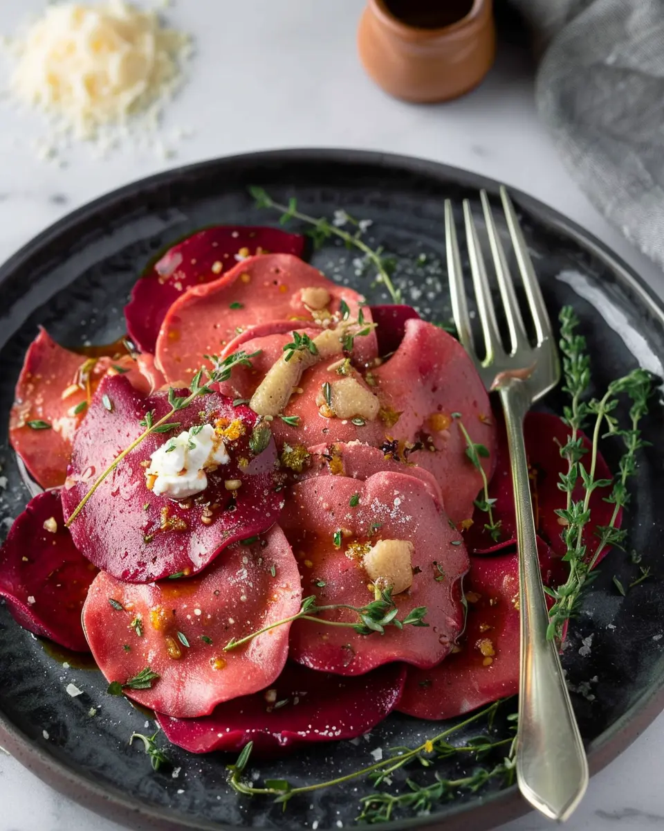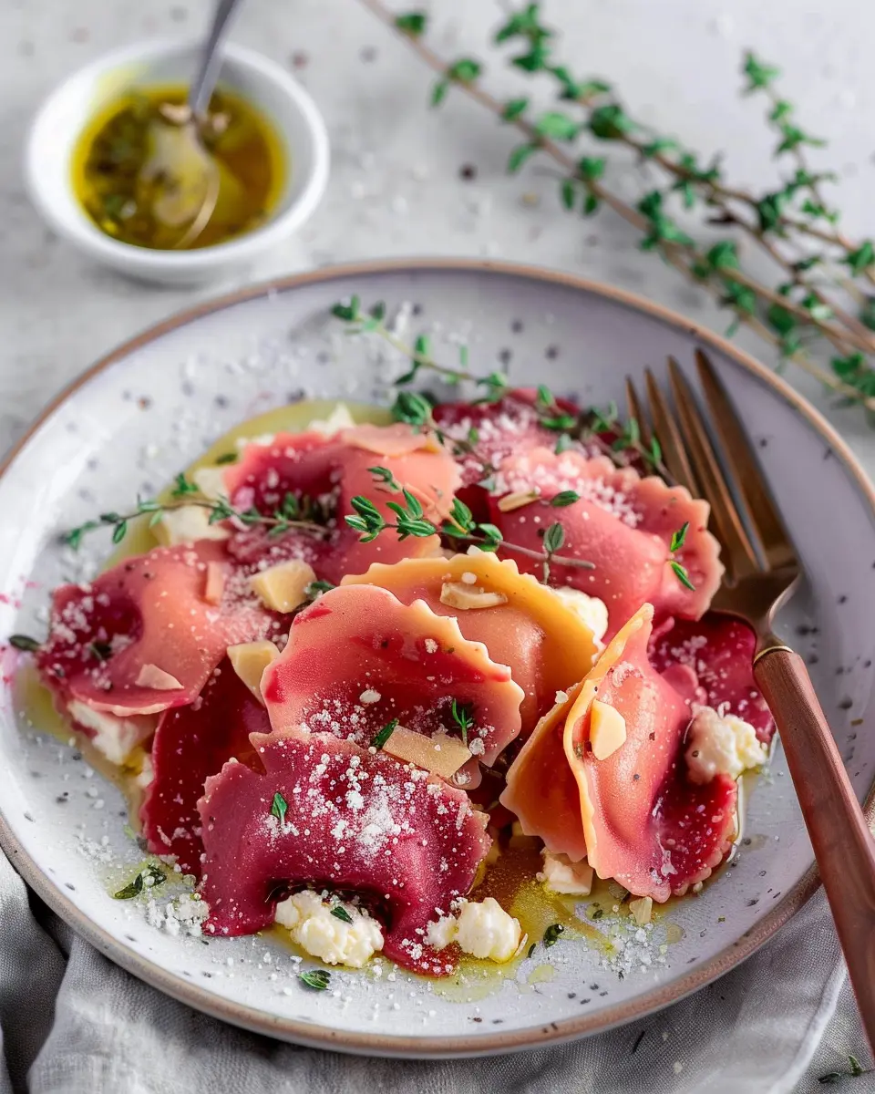 Experience the rich flavors of beet heart ravioli filled with creamy ricotta and fresh thyme, perfect for a comforting meal at home.