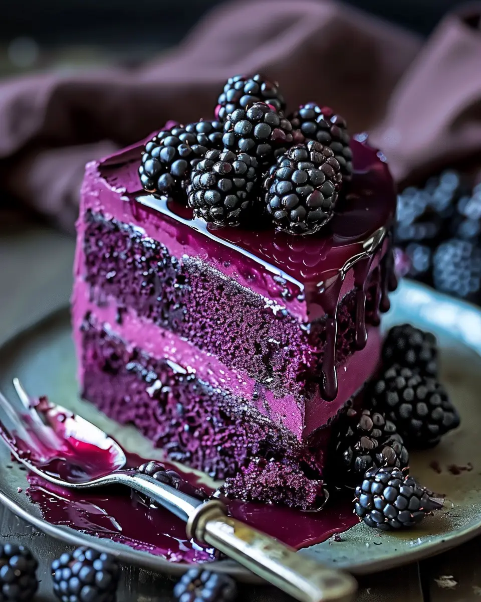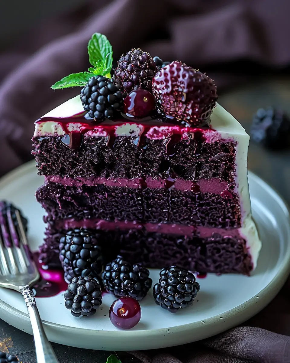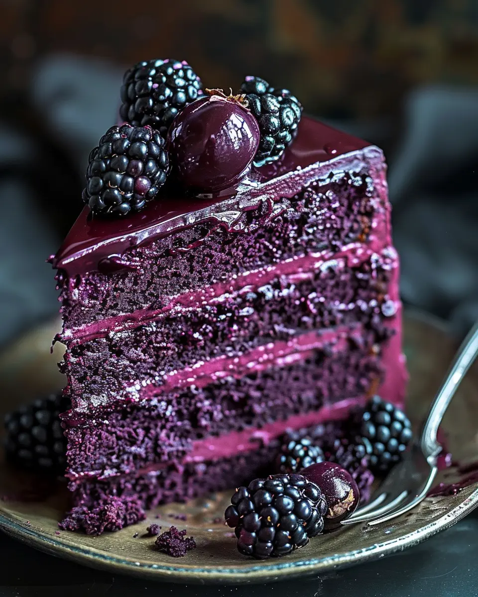 Storing your Blackberry Velvet Gothic Cake properly is essential to keep it fresh and delicious. If you have leftover cake, cover it tightly in plastic wrap or aluminum foil, or you can place it in an airtight container. It will stay fresh at room temperature for up to three days. If you want to retain its moisture for a longer period, consider refrigerating it for up to a week. For even longer storage, freeze individual slices wrapped tightly. Just ensure you allow it to thaw at room temperature before serving.