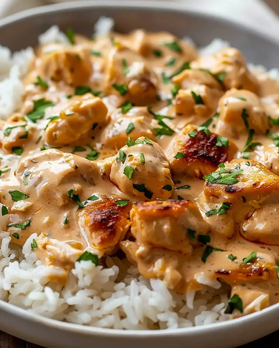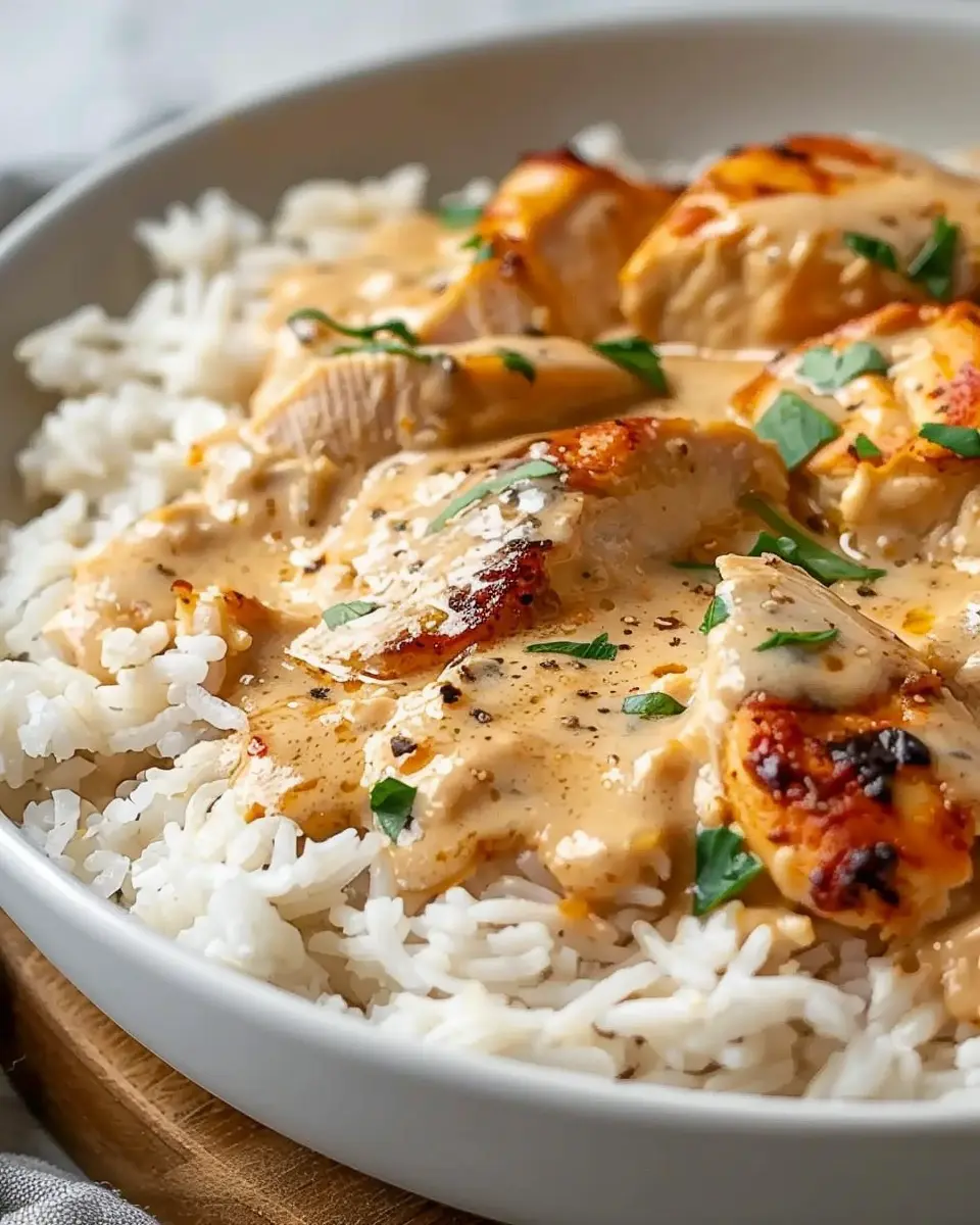 To complete your meal, prepare a bed of fluffy rice. Once cooked, scoop the creamy smothered chicken and its sauce right on top. Garnish with fresh herbs for a pop of color and additional flavor. Voila! You’ve created a comforting dish that’s perfect for a weeknight dinner or a cozy gathering.