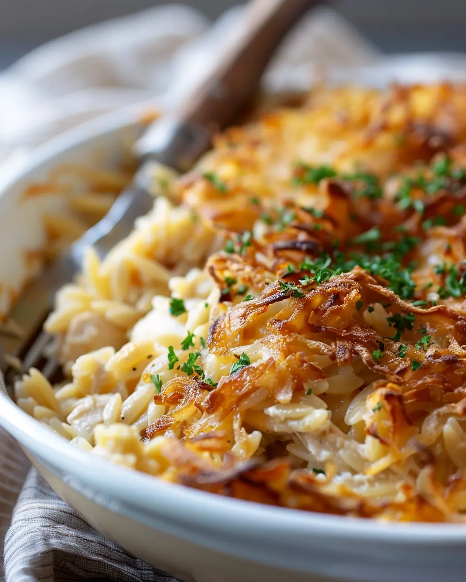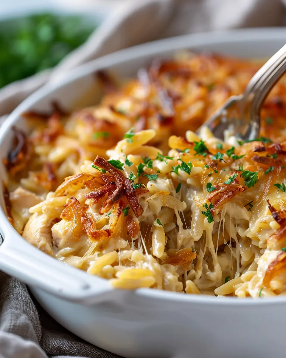 A delicious and comforting dish combining the flavors of French onion soup and chicken with orzo pasta in a cozy casserole.