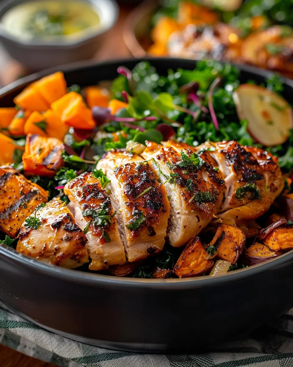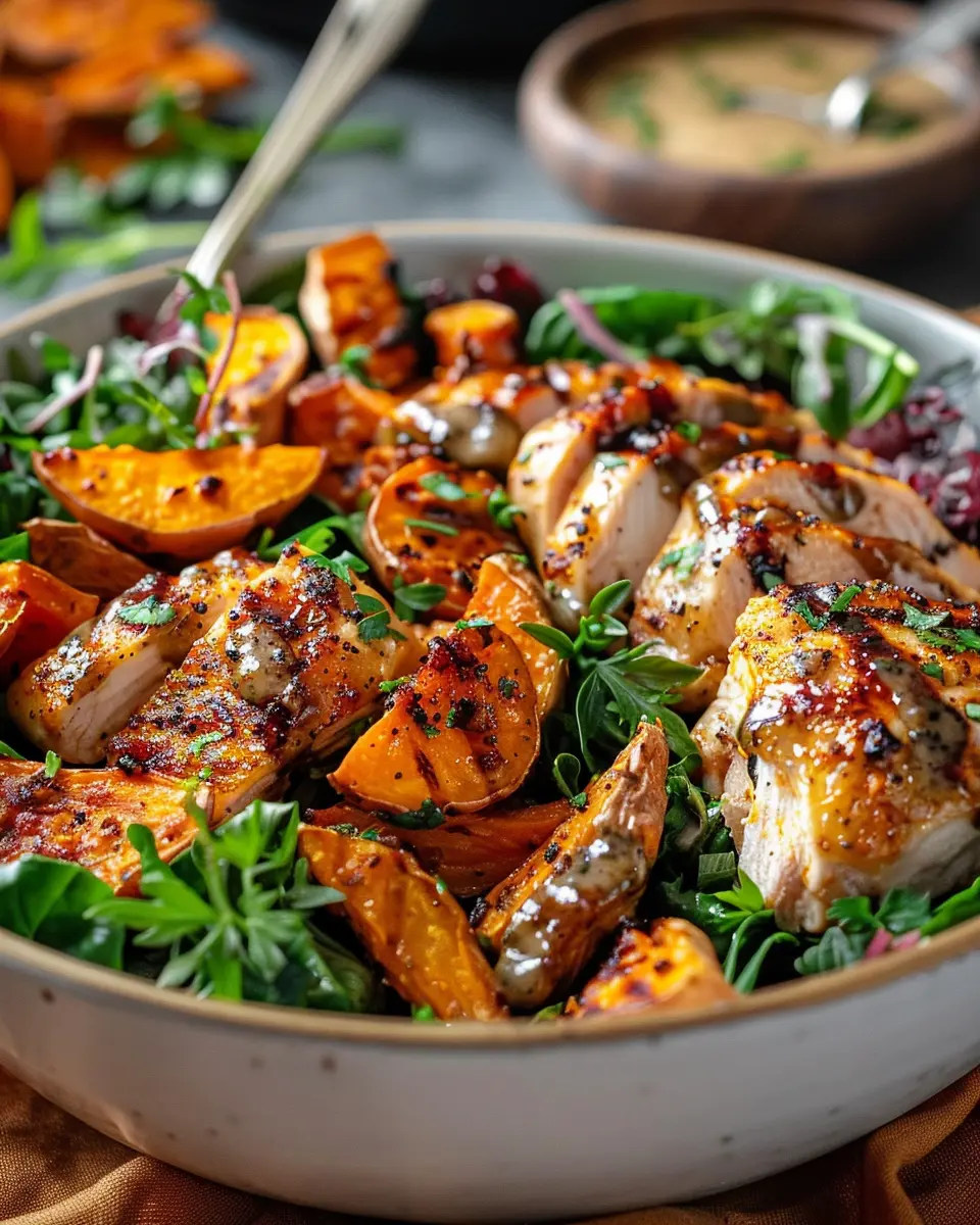 Delight in the flavors of Maple Dijon Chicken and Roasted Sweet Potato Bowls, perfect for a healthy meal.