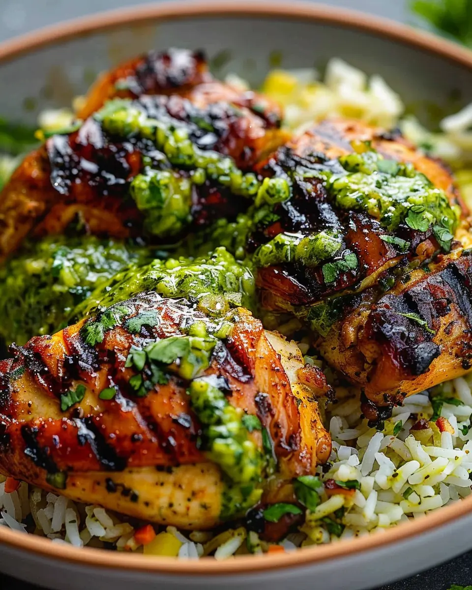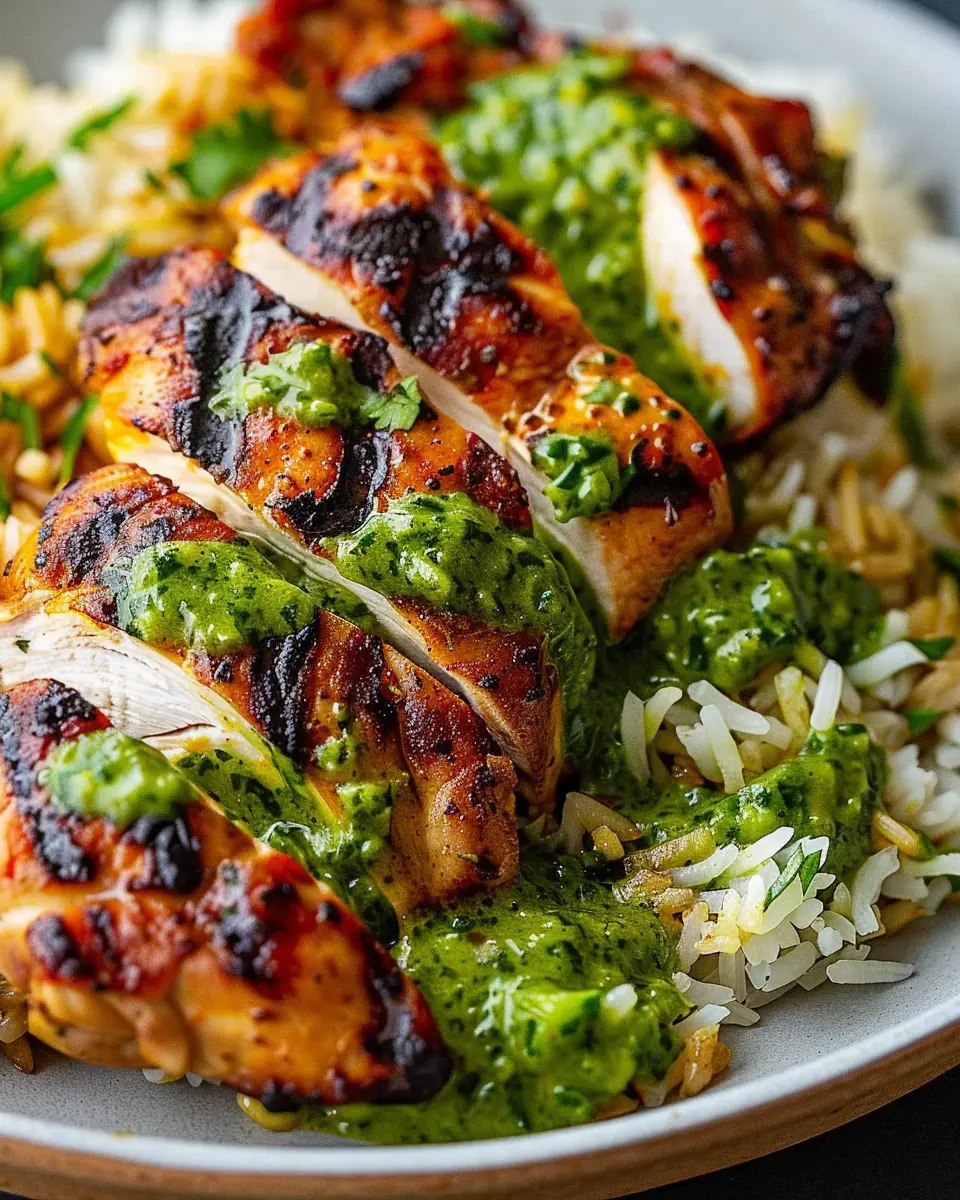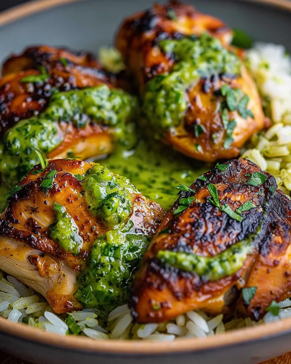 6. Serve chicken over rice with a drizzle of green sauce on top.